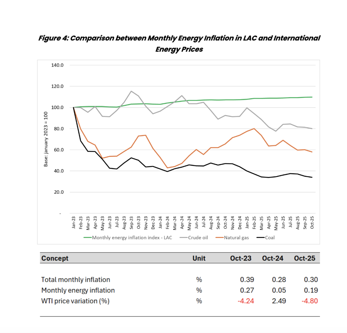 Figure 4 shows that the international oil price index records a slight decline of 1.6%, while the natural gas price index decreases by 3.45%. These trends are highly likely to explain the decline in monthly energy inflation in LAC, from 0.21% in September to 0.19% in October 2025. The attached table presents the monthly variation in the WTI price, which in October 2025 was negative at −4.80%, while in September 2025 it stood at −1.39%. This further deceleration would explain the evolution of the price indices.