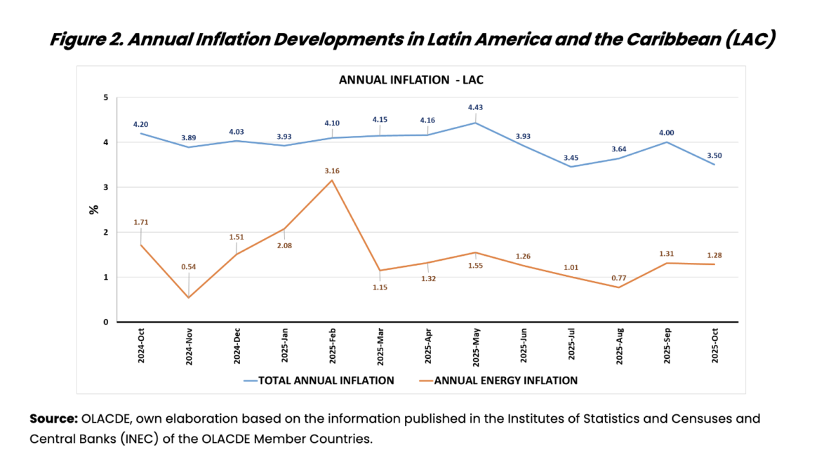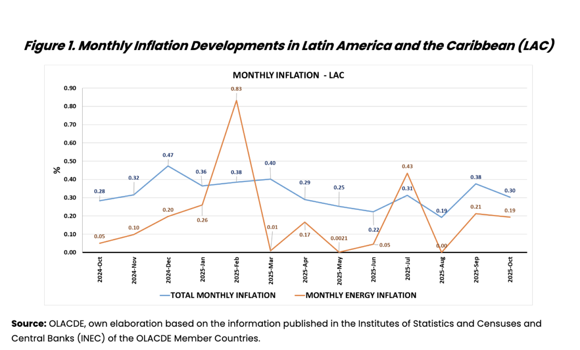 Monthly energy inflation in LAC between September and October 2025 recorded a decline, decreasing from 0.21% in September to 0.19% in October. This represents a 9.5% reduction compared to the previous month, mainly because, of the 20 countries analyzed, 12 showed a decline in the indicator, as several of them implemented tariff adjustments to electricity prices and fossil fuels.