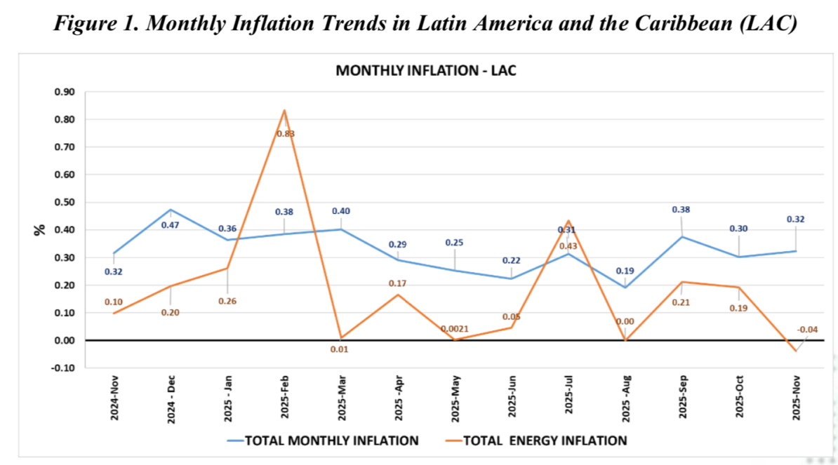 On the other hand, although a rebound in the price of natural gas in North America was observed towards November, associated with increased demand and seasonal weather conditions, this factor exerted only partial upward pressure in LAC; the combined effects of the oil drop and tariff measures prevailed widely, generating a net regional downward impact mainly due to the weight of oil-derived fuel prices and electricity prices in the energy basket.