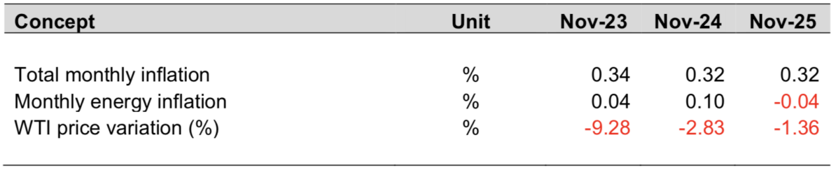 On the other hand, the natural gas price index shows periods of recovery in mid-2024 and part of 2025 and a rebound in November 2025 due to a seasonal increase in demand and greater dynamism of LNG in the United States, which tends to pressure the increase in electricity rates of dependent gas systems. However, this impulse was not enough to reverse the fall in the energy inflation index in November 2025, which reached a negative value.
