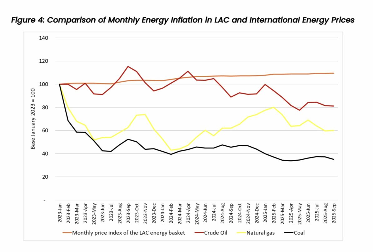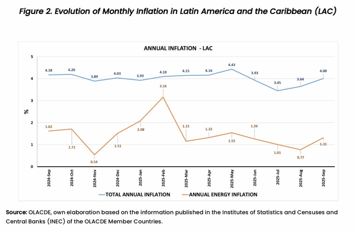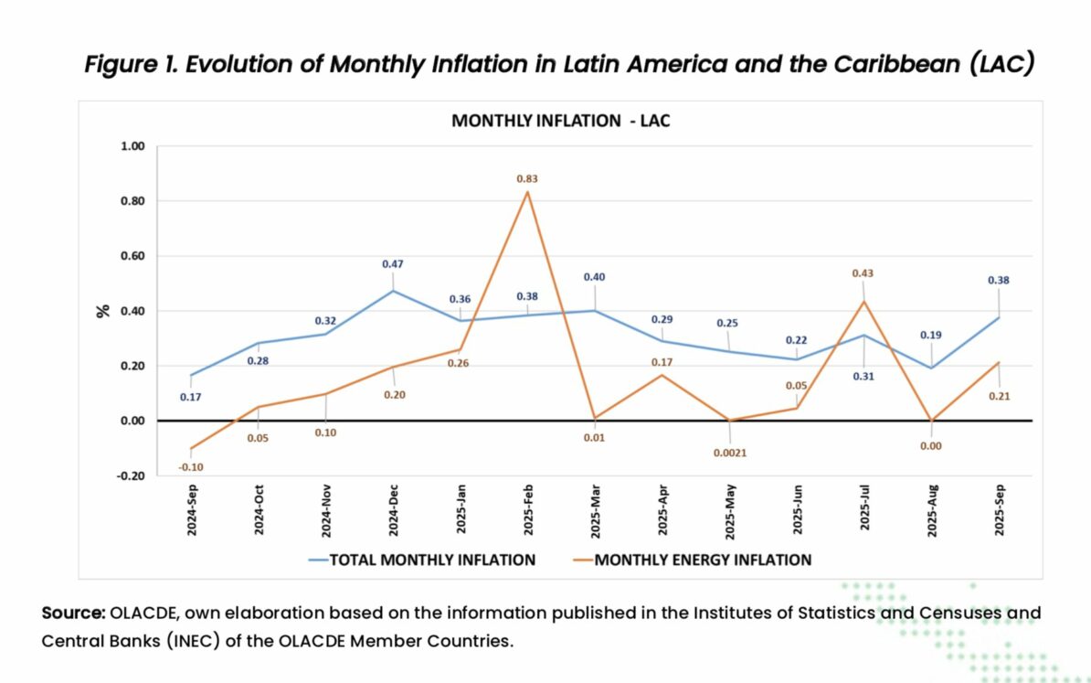 Monthly energy inflation in LAC in September 2025 was 0.21%. Of the 20 countries analyzed in the region, 12 registered positive variations in price indices (increased), 6 presented negative variations (decreased), and 2 presented no variation.