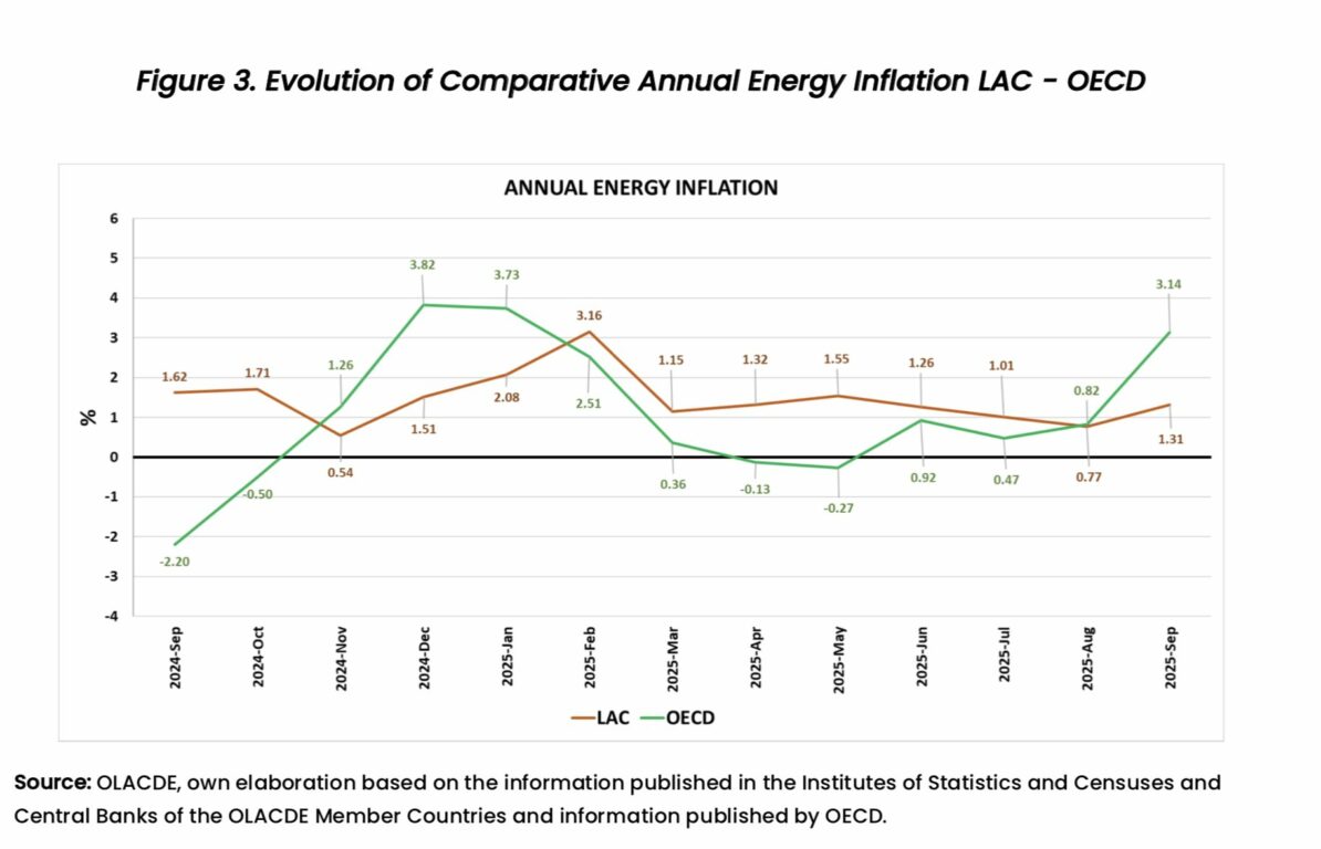 After six consecutive months in which year-on-year energy inflation in the OECD remained below that recorded in LAC; for the second month in a row, OECD figures exceed those in LAC. In September 2025, a more marked difference is presented, with figures of 3.14% from OECD and 1.31% from LAC; compared to 0.82% from OECD and 0.77% from LAC in August 2025; which reflects a higher growth rate of the price indices of the energy basket in the OECD this month.