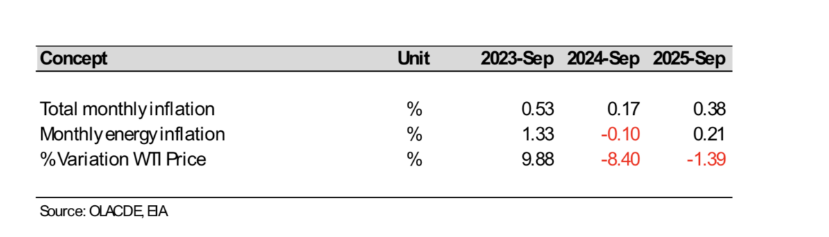 The attached Table presents the monthly growth of the WTI price, which for September 2025 is negative by -1.39%, much lower than that recorded in August 2025 of -5.16%, and said slowdown would explain the evolution of the price indices.