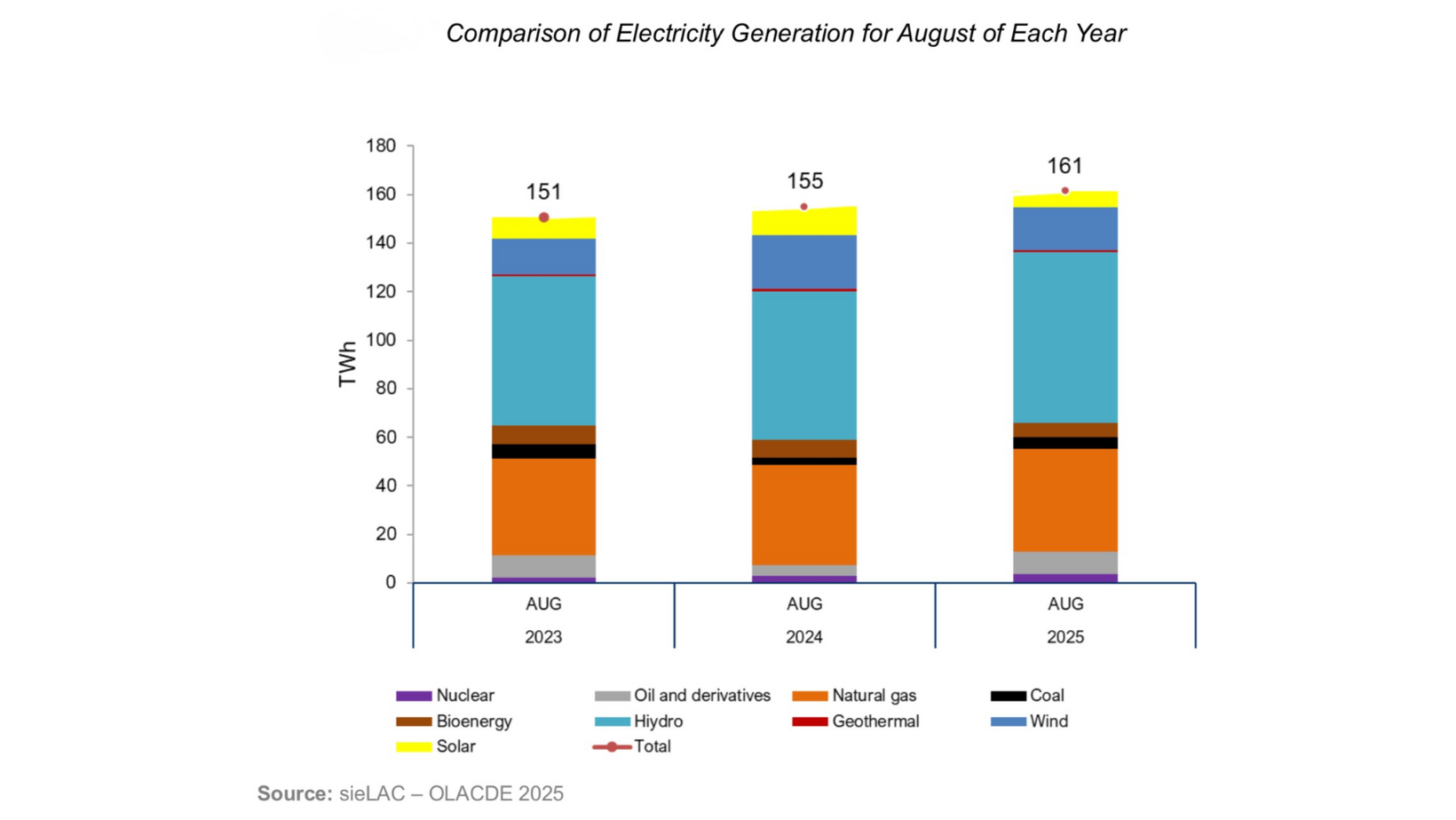 On a year-on-year basis (August 2024 vs. August 2025), total electricity generation in Latin America and the Caribbean increased by 3.9%. Hydropower emerged as the resource with the largest absolute growth over this period, with an increase of 9.4 TWh.