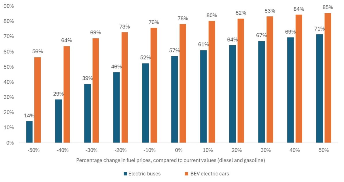 The mass public transport segment presents the most disruptive figures for national and municipal budgets. A single electric bus generates annual savings of USD 26,000 compared to a diesel unit. However, profitability becomes exponential during a crisis: if fuel prices increase by 50%, annual savings per unit surge to USD 48,750, nearly doubling the economic benefit and positioning electric buses as the most resilient asset for urban infrastructure.