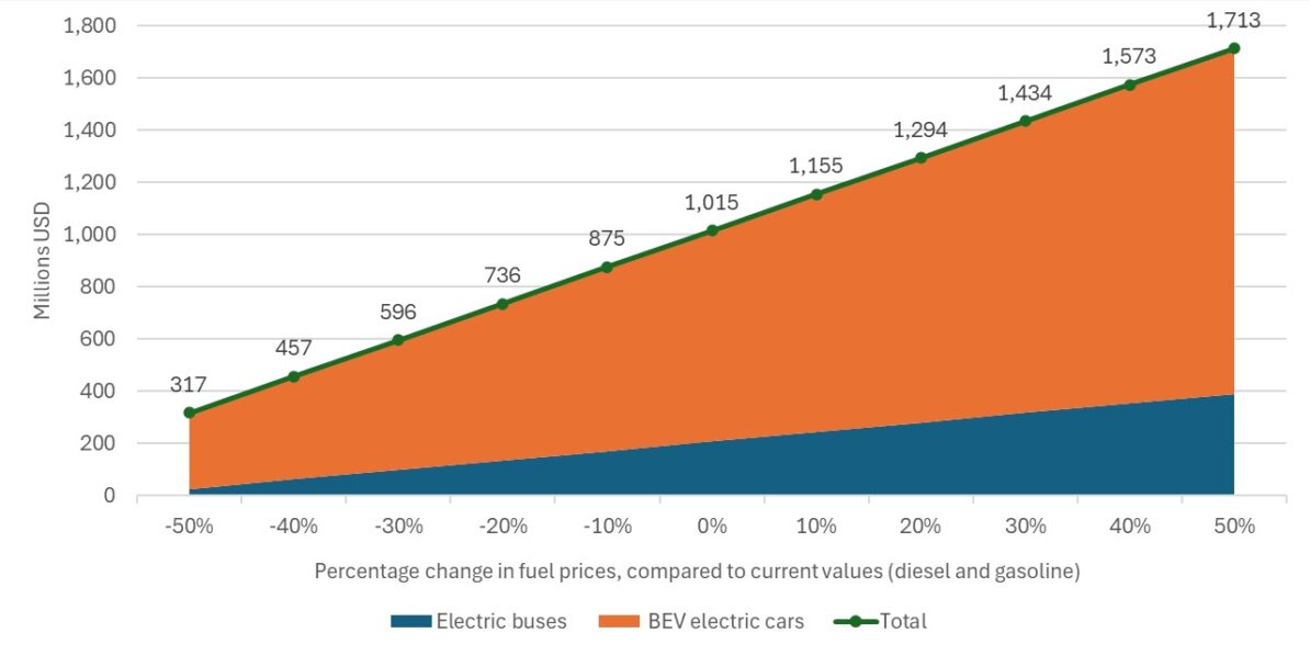 In nominal terms, operating an electric car today is USD 2,018 cheaper per year than a gasoline vehicle; a gap that widens significantly if crude oil prices continue to rise: with a 50% increase in fuel prices, annual savings would reach USD 3,308.