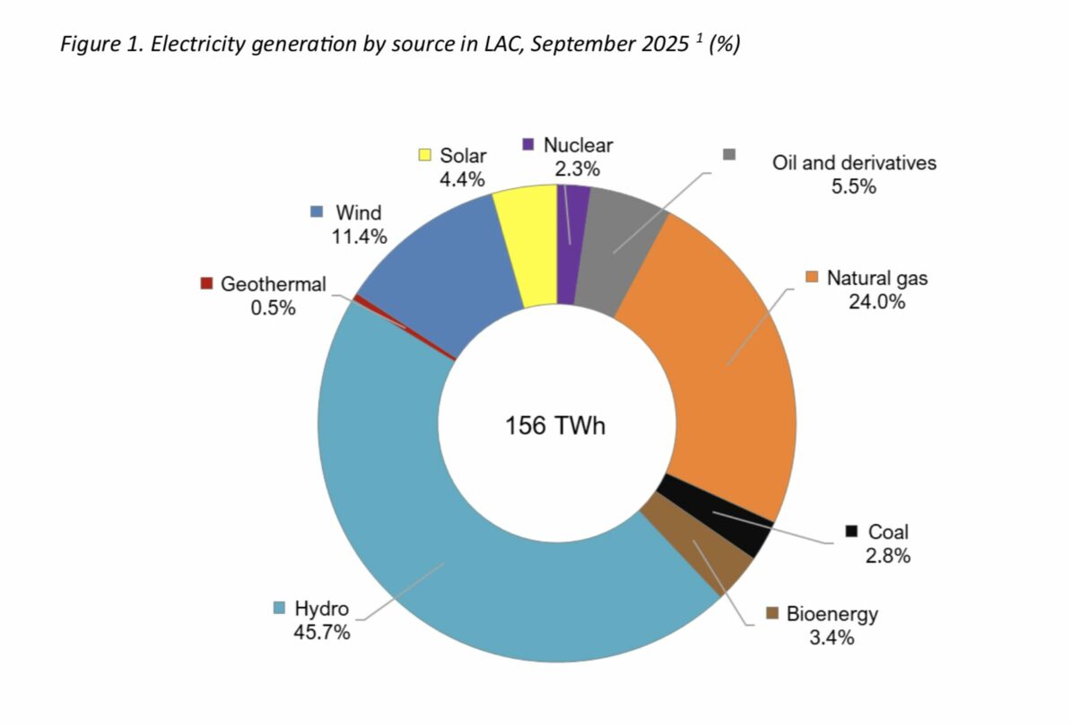 The Latin American and Caribbean Energy Organization (OLACDE), in its Monthly Electricity Generation Report, reported that in September 2025 electricity generation in the region reached 156 TWh, representing a year-on-year increase of 3.3%. Hydropower remained the main source of generation, accounting for 45.7% of the total, driven by improved hydrological conditions in several countries across the region.