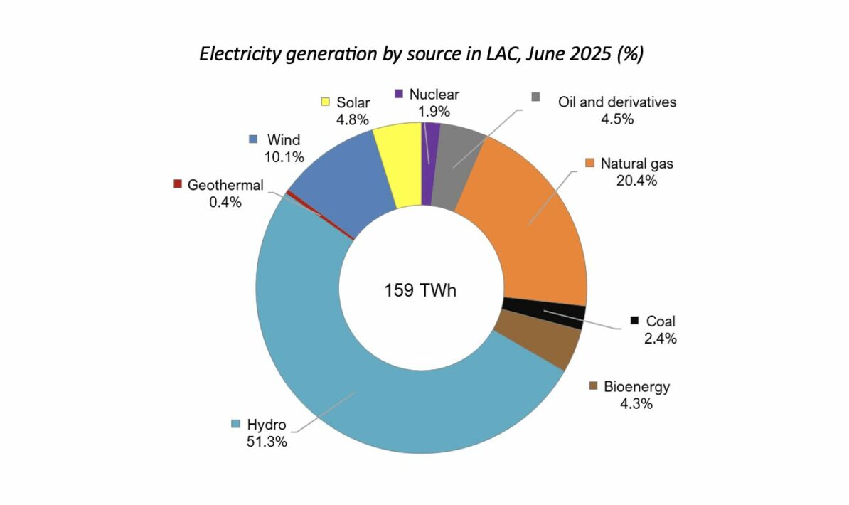 According to the electricity generation report by the Latin American Energy Organization (OLADE), in June 2025 Latin America and the Caribbean generated 159 terawatt-hours (TWh) of electricity, with 71% coming from renewable sources. Hydropower maintained its leadership with a 51.3% share, followed by natural gas (20.4%), wind (10.1%), and solar (4.8%), consolidating a predominantly clean regional energy matrix.