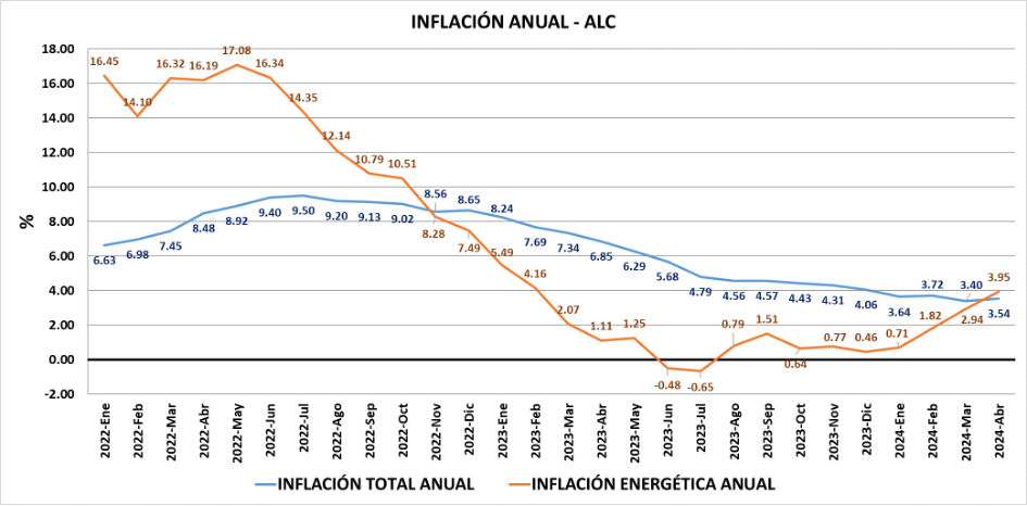 Según OLACDE, en abril 2024, la inflación energética mensual en ALC fue 0,89% y la tasa anual 3,95%