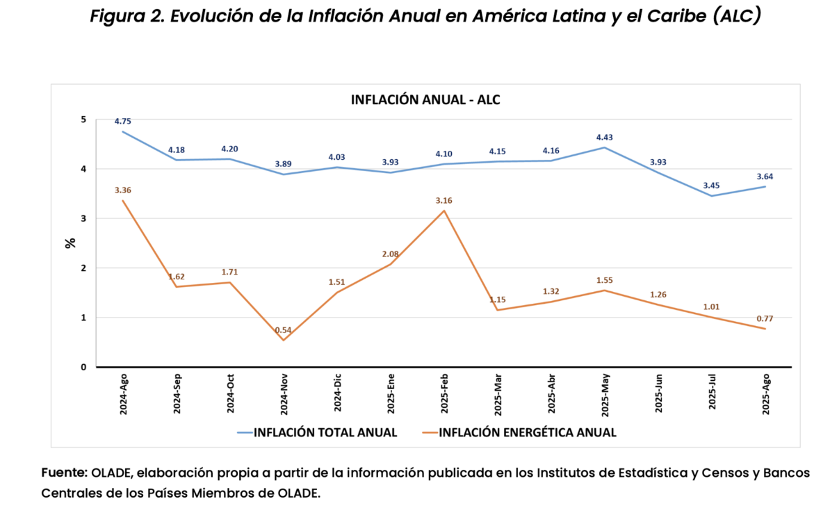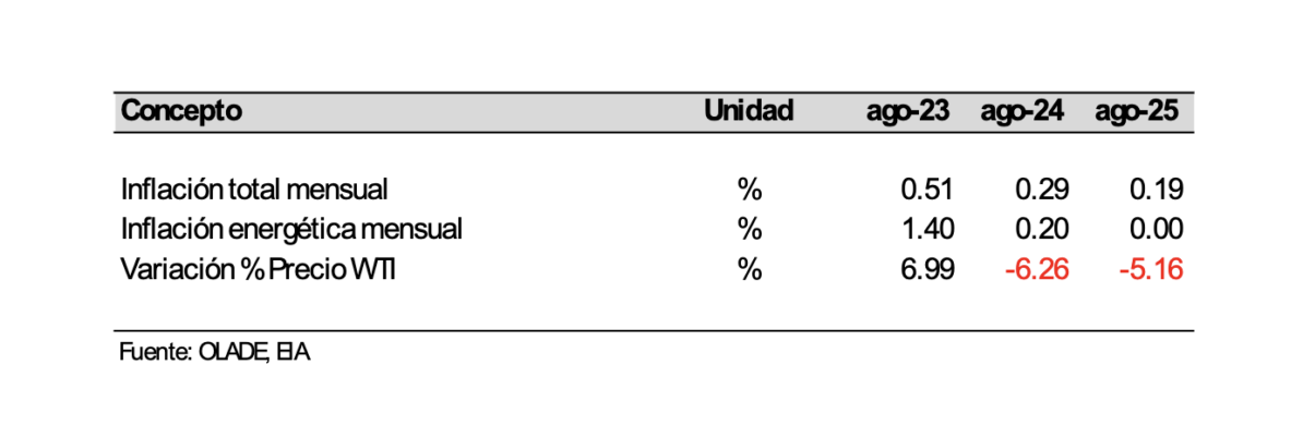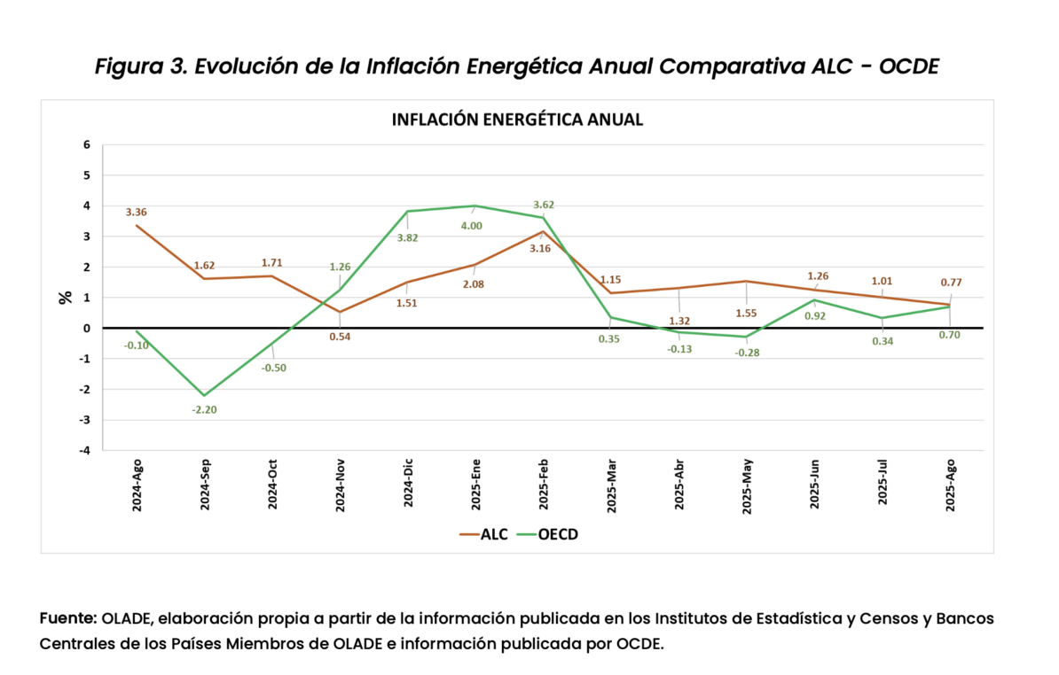 La inflación energética interanual en los países de la OCDE aumentó de 0.34% en julio a 0.7% en agosto de 2025, mientras que en ALC disminuyó de 1.01% en julio a 0.77% en agosto del 2025.